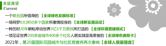 随着该项活动历届的成功举办和 2021年第20届全球国际花园城市与社区竞赛的启动,全球无数热切的目光再次聚焦,城市和企业的光荣与梦想又将隆重上演!